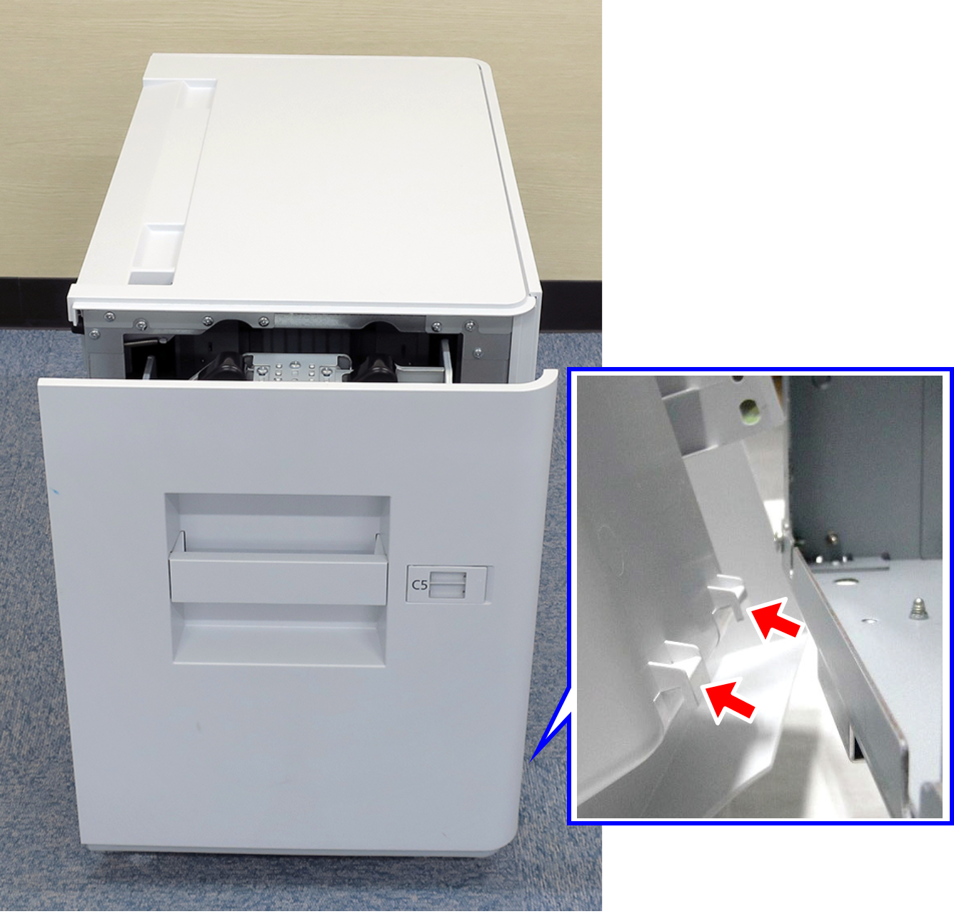 滑动拆下大容量进纸器前盖组件,同时释放定位销(4处)。
