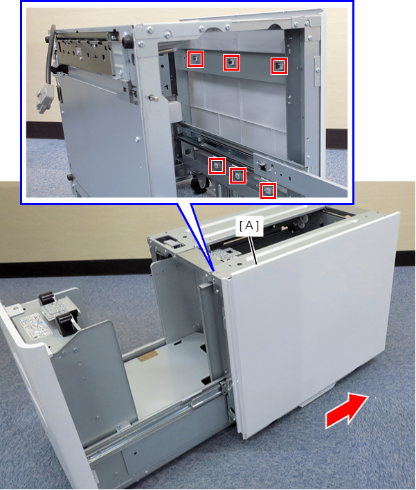 - 请参阅以下内容,从打印机主机上拆下大容量供纸单元。