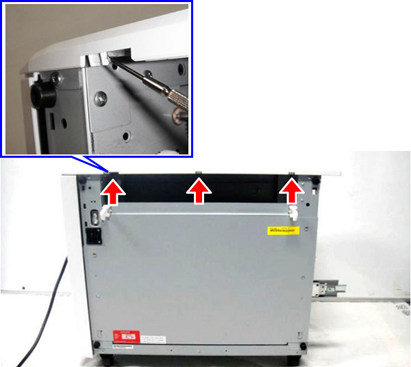 大容量进纸器安装步骤 - 拆下螺丝,然后拆下电缆盖。