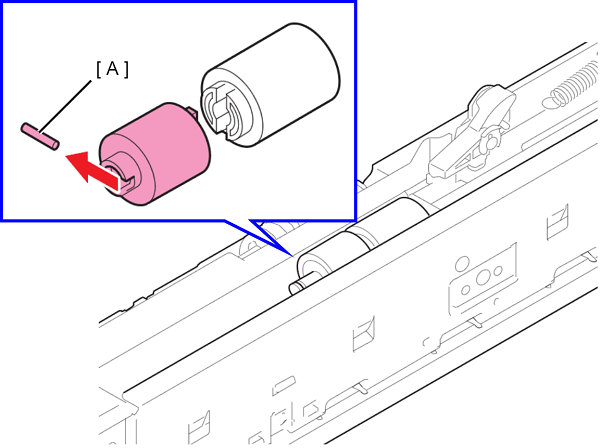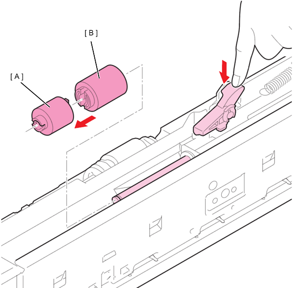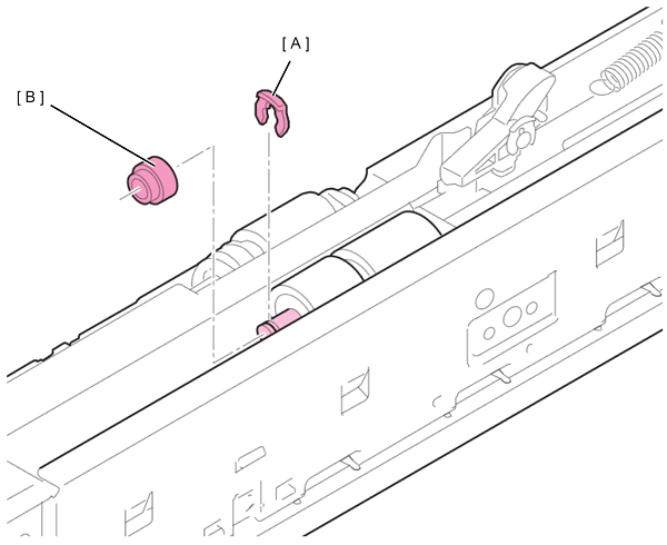 翻转进纸单元,从阻抗辊轴承上拆下卡簧(A)和垫片(B)。