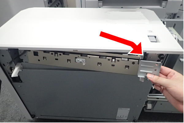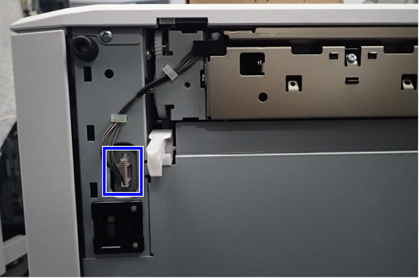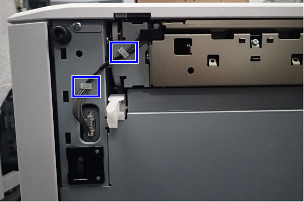 大容量进纸器安装步骤 - 拆下螺丝,然后拆下电缆盖。