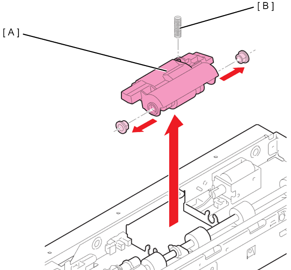 滑动两侧上的轴承,拆下进纸辊支架(A)和弹簧(B)。
