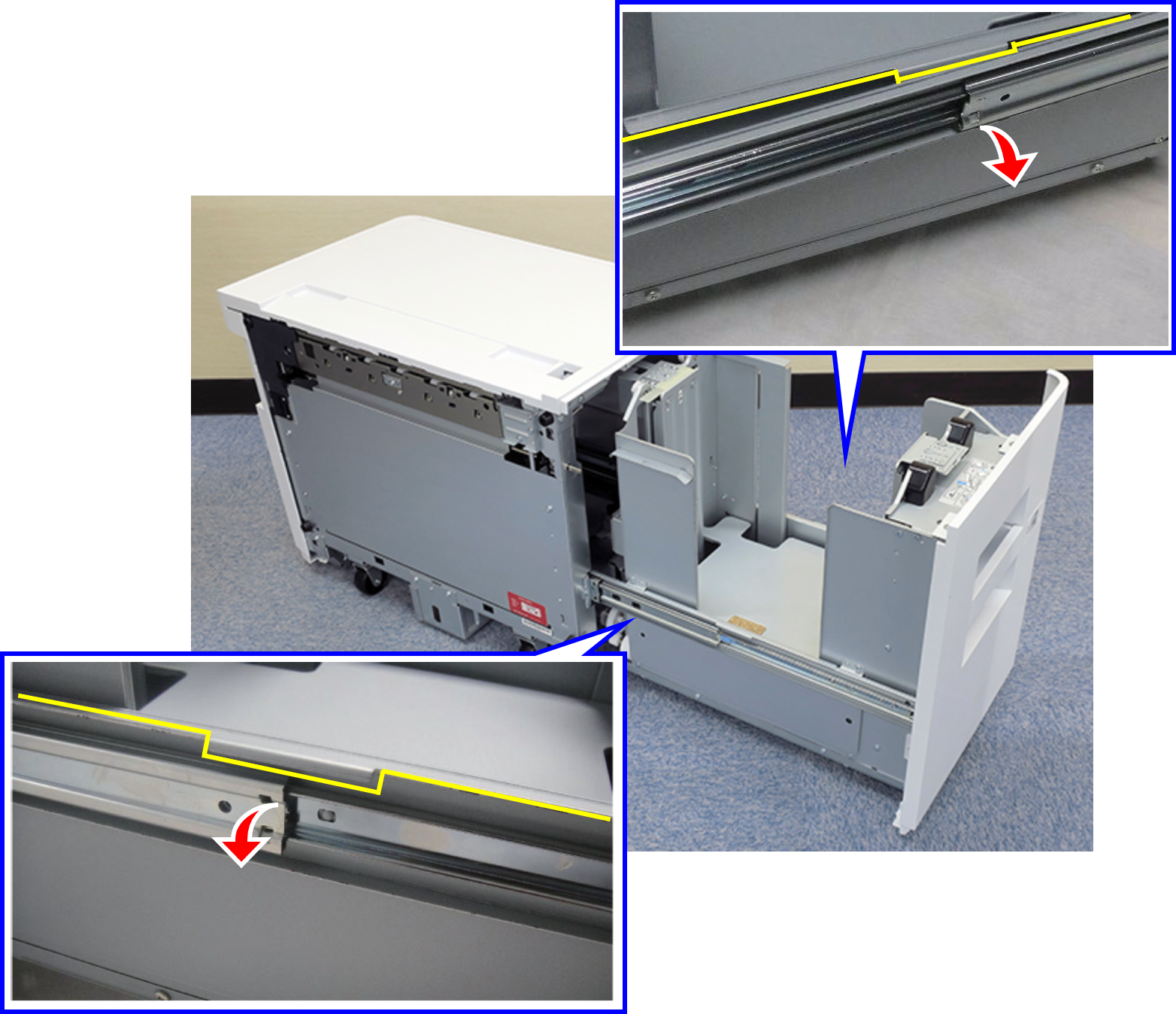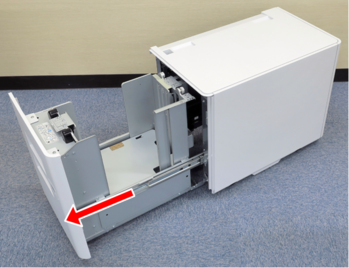 Check Point / チェックポイント- 如果拆下纸盒滑轨锁定销,可以将大容量纸盒拉出最大量。