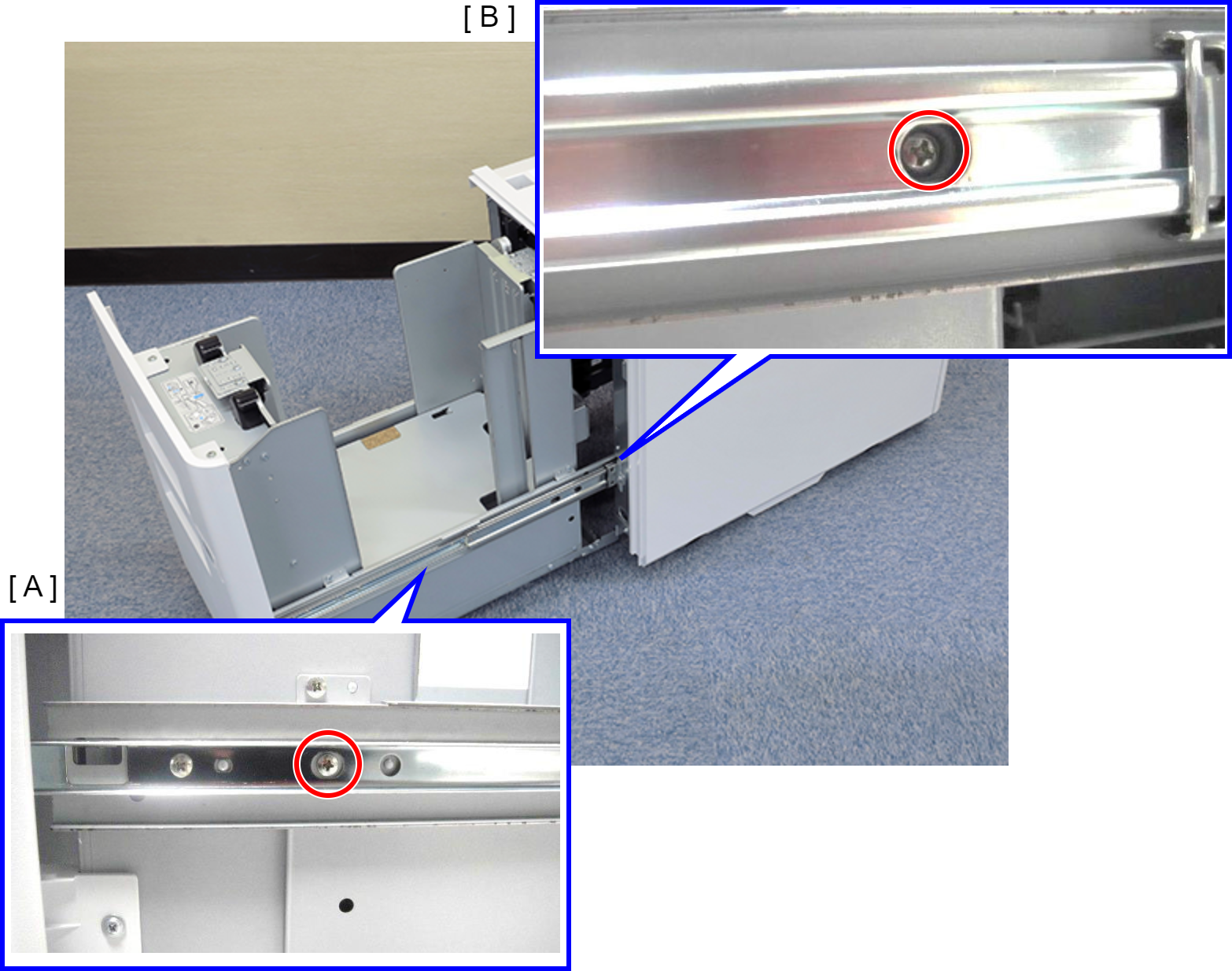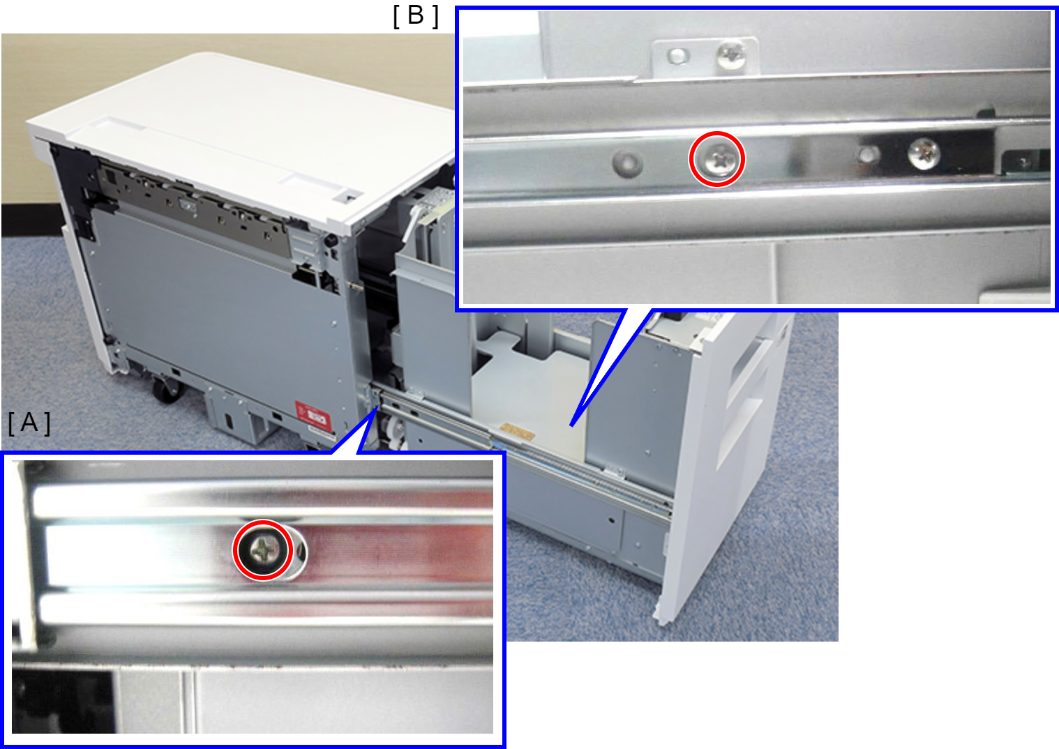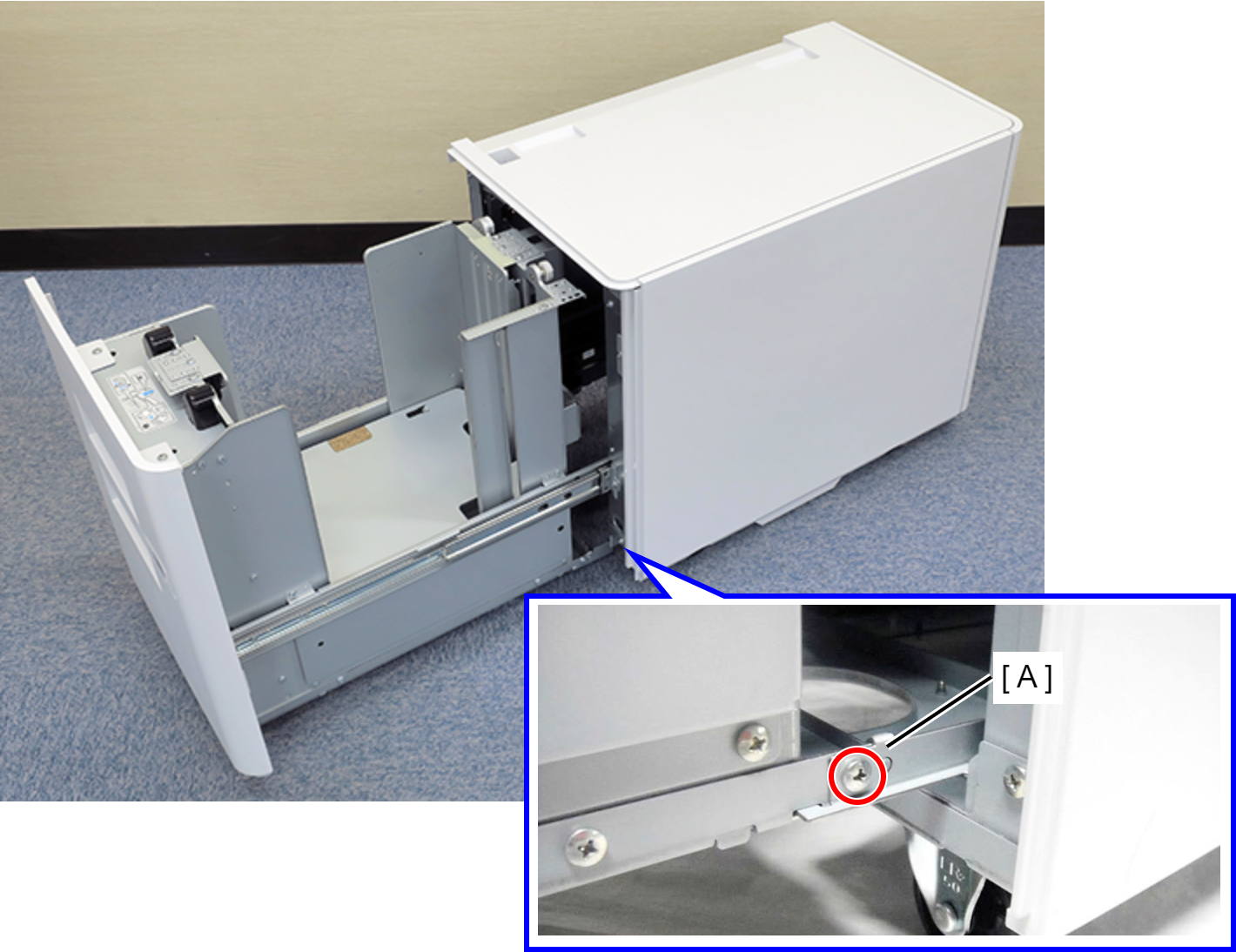 拆下螺丝,然后拆下纸盒滑轨锁定销(A)。