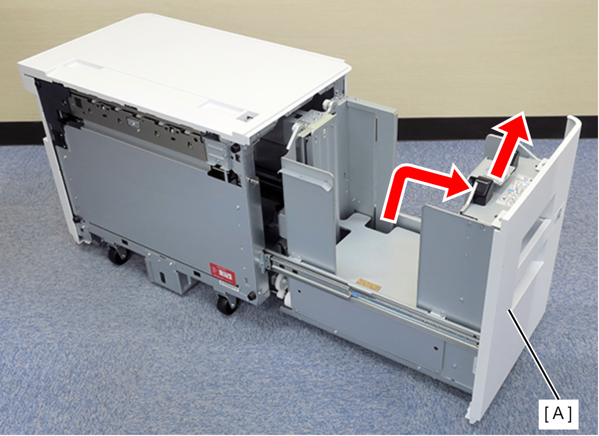 - 有一个卡钩零件,因此沿箭头方向拉出大容量纸盒(A)将其拆下。